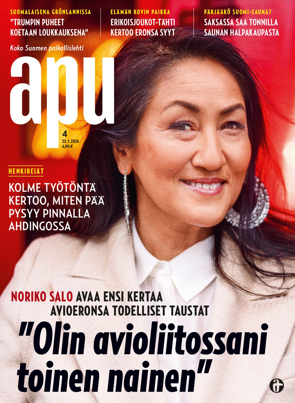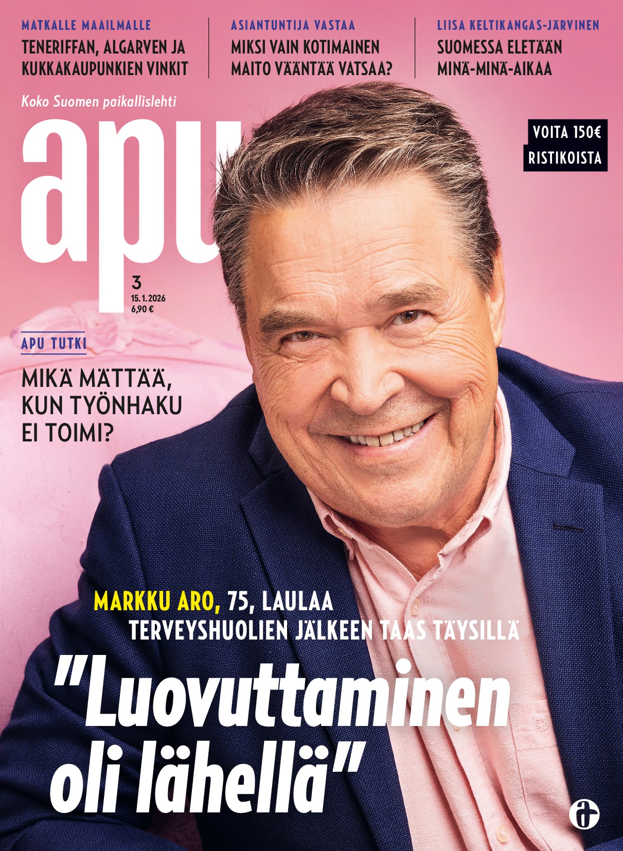 Apu on Suomen luetuin viikkolehti, jota lukemalla pysyy ajan tasalla. Apu kertoo tapahtumien taustat, tarjoaa rentouttavia lukuhetkiä ja tuo suomalaisen luonnon kauneuden jokaisen ulottuville.Apu on täynnä tarinoita erilaisista ihmisistä, joiden kohtalot koskettavat, liikuttavat ja saavat tuntemaan empatiaa – ja näkemään toisenlaisin silmin. Kerran kuukaudessa Apu on tavallista kookkaampi ja sivumäärältään tuhdimpi lukupaketti, Suur-Apu.Rakkaudesta luontoon. Luonto on nyt entistäkin lähempänä suomalaisten sydämiä. Tilaajana saat kolme upeaa Apu Luonto -erikoisnumeroa vuodessa viikkolehden lisäksi.Apu on mainio matkakumppani. Kuusi upeaa Matka-ekstraa vuodessa. Paljon kotimaankohteita ja juttuja naapurimaista, mutta myös ihania matkoja unelmien kohteisiin.Täyttä asiaa terveydestä. Kuusi Terveys-ekstraa vuodessa, joissa on luotettavaa asiaa terveydestä helposti ja ymmärrettävästi. Avussa asiantuntijat, kuten maalaislääkäri Tapani Kiminkinen, vastaavat lukijoiden terveyskysymyksiin.