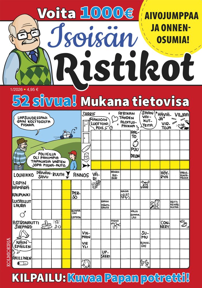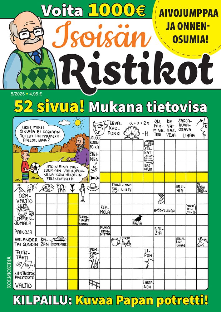 Känn värmen och humorn i Isoisän Ristikot - Farfars Korsord som bjuder på en samling av gemytliga och roliga bildkorsord från Finlands bästa korsordsmakare. Här vävs enkelhet och skrattfullhet samman för att skapa en unik läsupplevelse. Bland de traditionella korsorden finner du också de mest omtyckta specialuppgifterna för en extra dos av spänning.Med sex utgåvor varje år erbjuder Farfars Korsord 52 sidor av avkopplande hjärngymnastik. Varje nummer är en resa genom underhållande korsord, perfekt för att koppla av och låta hjärnan arbeta på sitt eget sätt.Och det är inte allt - en bonustävling ger chansen att vinna hela 1000 euro! Varje nummer är inte bara en möjlighet att lösa pussel utan också en chans till fantastiska belöningar.Utforska världen av Isoisän Ristikot - Farfars Korsord, där enkelhet, skratt och överraskningar väntar. Bli en del av gemenskapen av avslappnade och roliga korsordsentusiaster!
